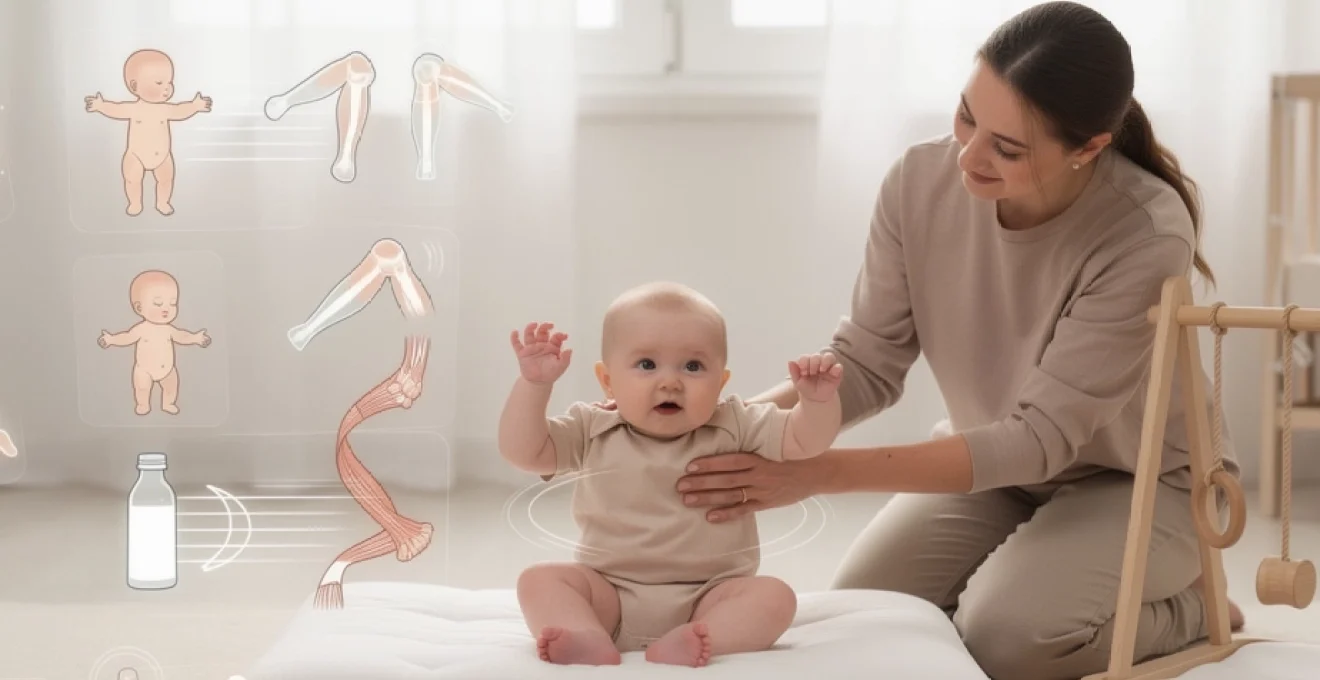 Au cours des premiers mois, le nourrisson présente une hypotonie physiologique, en particulier au niveau du tronc. Concrètement, cela signifie que ses muscles ne sont pas encore assez toniques pour maintenir durablement une posture stable. Résultat : lorsqu’il essaie de bouger la tête ou de soulever un bras, l’ensemble du corps se met à bouger de façon globale, donnant une impression de « gigotage généralisé ».
