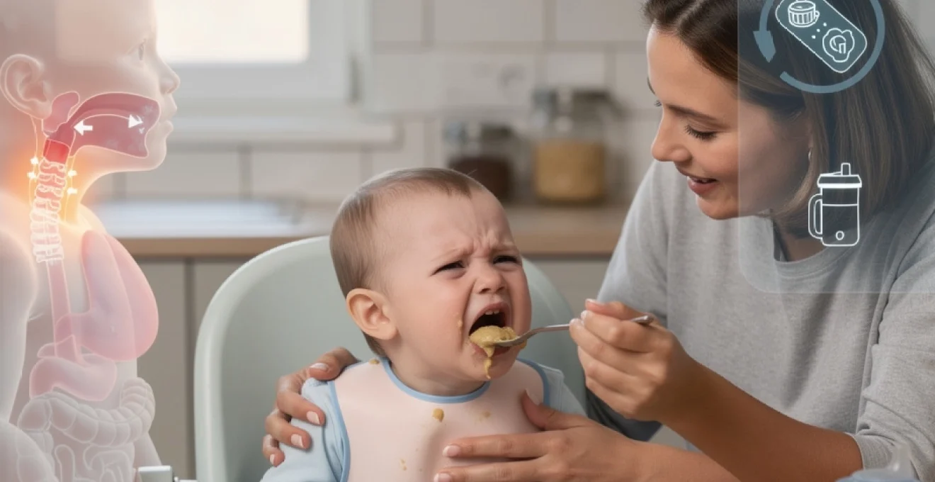 défi majeur pour les bébés de 6 à 24 mois. Au début de la diversification, ils doivent apprendre à coordonner simultanément succion, déglutition et respiration, alors qu’ils n’avaient jusque-là qu’à gérer le flux du lait. Il suffit parfois que la purée soit donnée un peu trop vite, que la consistance soit plus épaisse que d’habitude ou que bébé soit légèrement enrhumé pour perturber cette coordination fine.